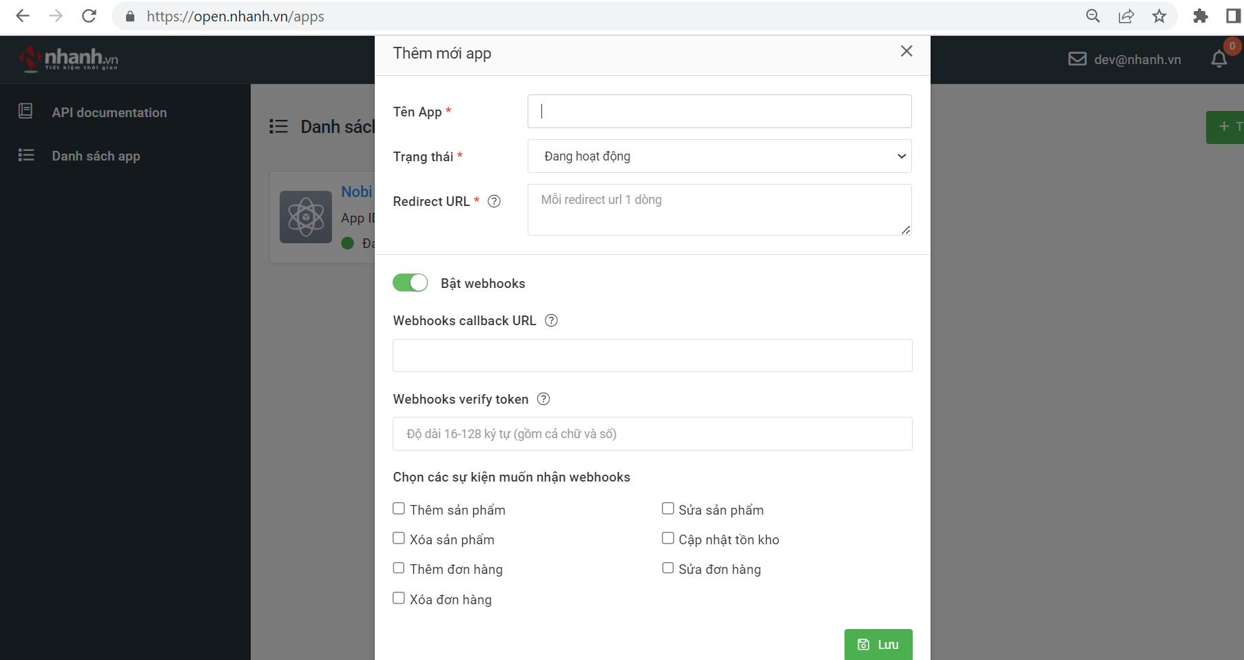 * Webhooks callback URL: Copy vào phần thiết lập Webhooks của nhanh, để nhận hook từ nhanh nếu cần (open.nhanh.vn)