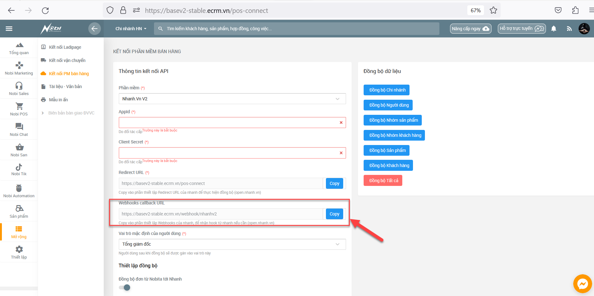 \- Webhooks callback URL: Lấy dữ liệu từ bên Nobi pro ( vào Mở rộng/Kết nối PM bán hàng)
