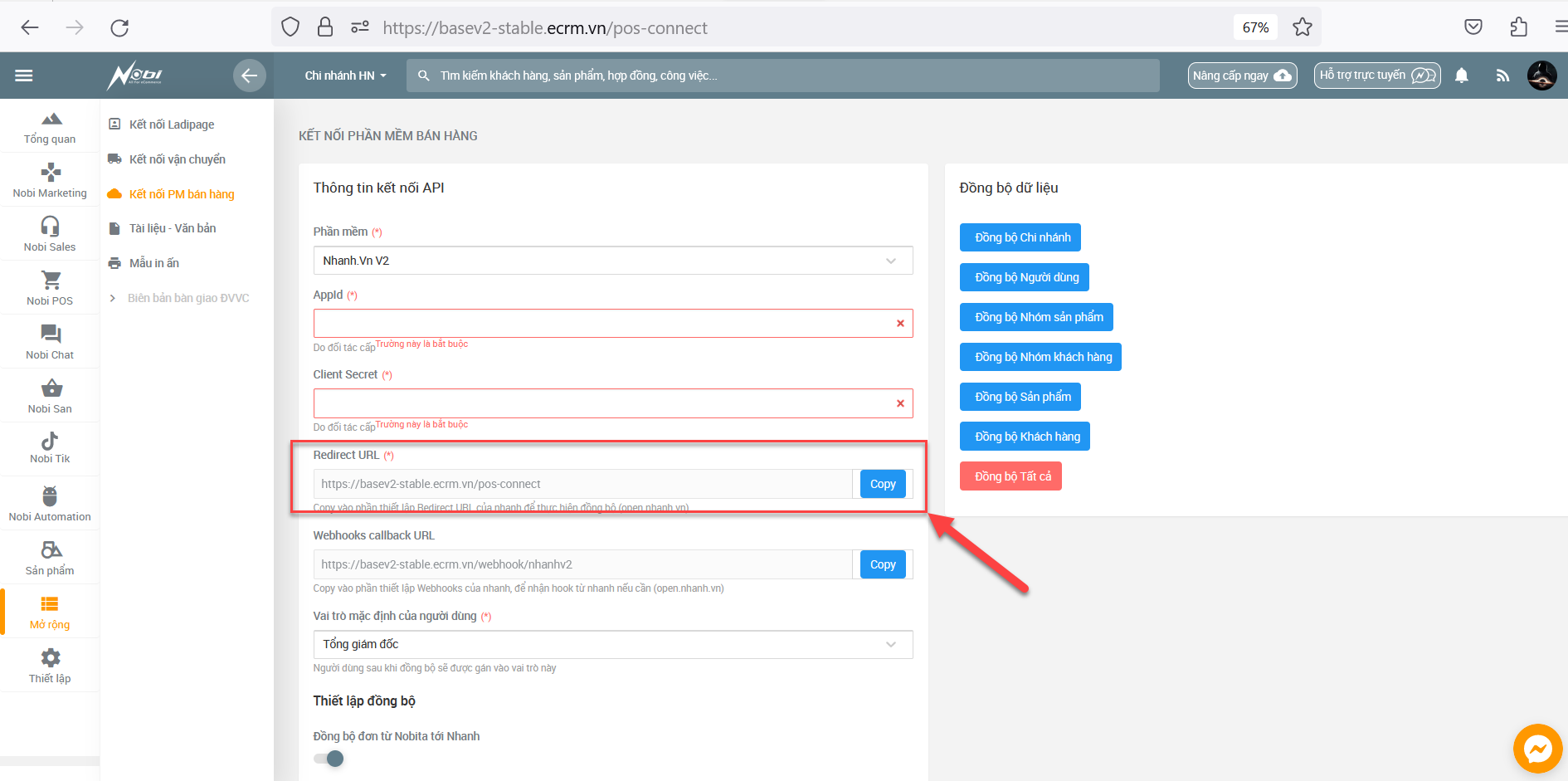 \- Redirect URL: Lấy dữ liệu từ bên Nobi pro ( vào Mở rộng/Kết nối PM bán hàng)