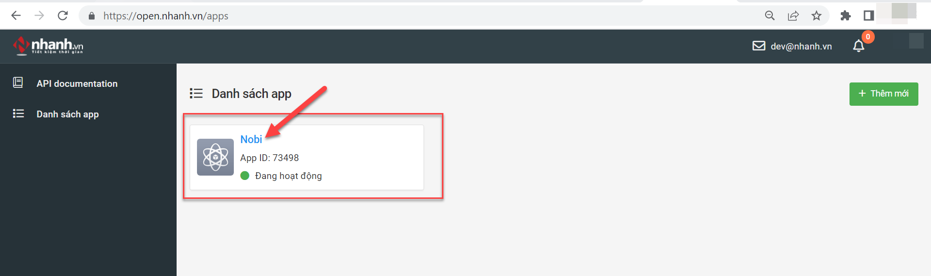 B1: Đầu tiên khi đã có tài khoản đăng ký bên Nhanh, đăng nhập vào open.nhanh.vn để thiết lập cài đặt API kết nối với Nobi pro.