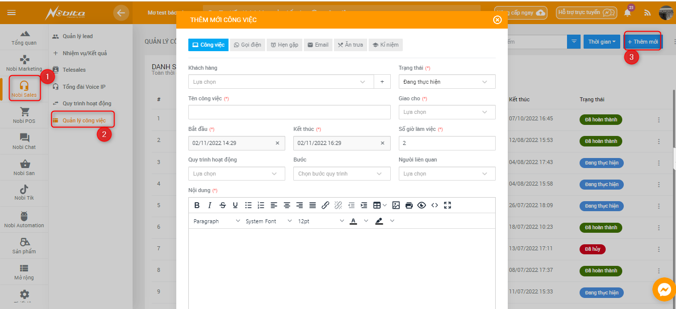 * Chọn trạng thái công việc (Xem hướng dẫn thiết lập trạng thái: [**TẠI ĐÂY**](https://help.nobita.pro/thiet-lap/danh-muc/trang-thai-cong-viec))