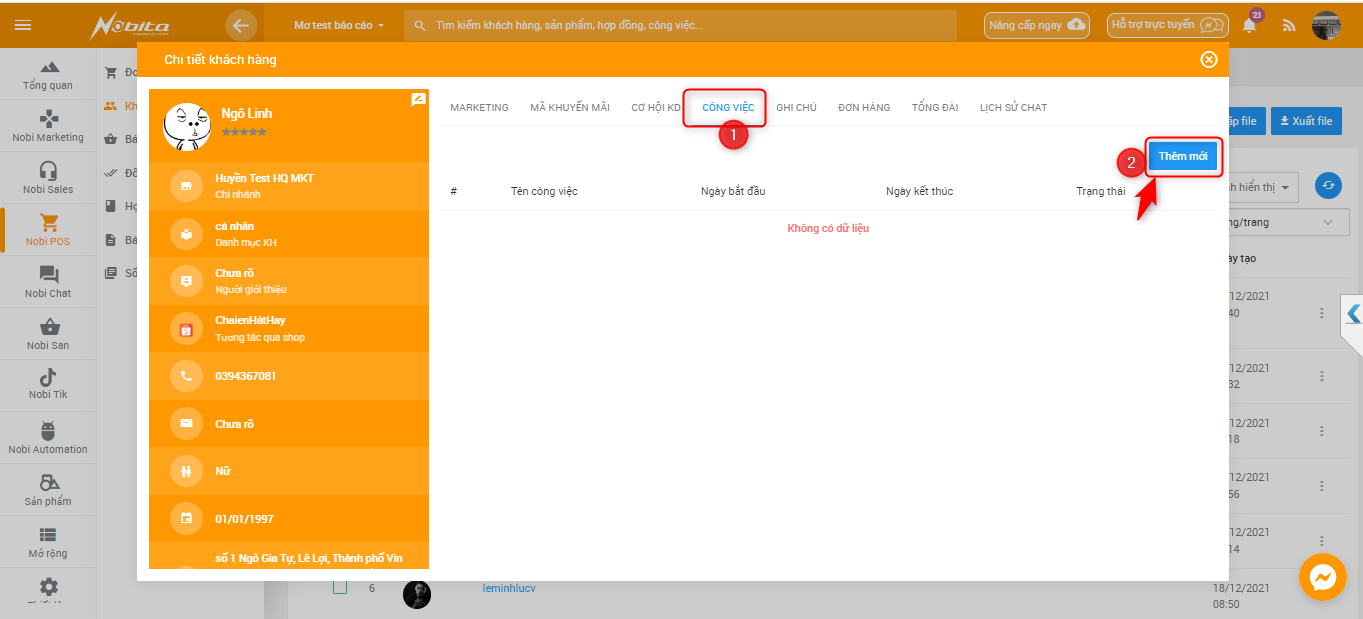 **Cách 2**: Thêm công việc cho khách hàng khi ở view Danh sách khách hàng Nobi Pos --> Khách hàng