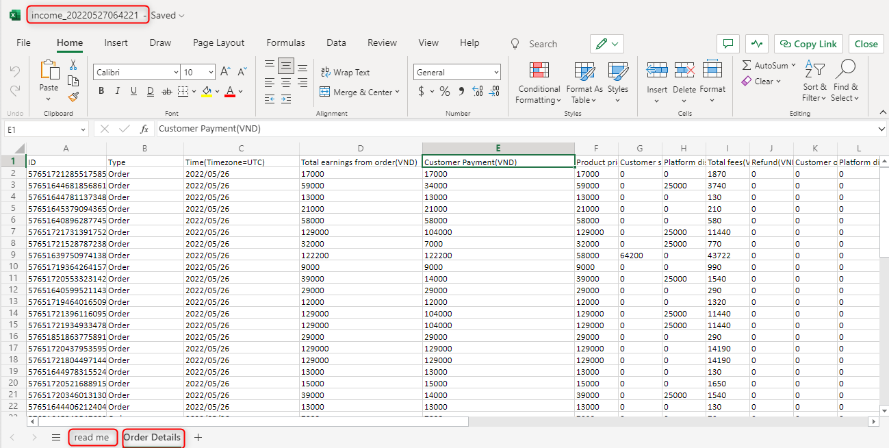 2\. File đối soát sẽ có tên file là income và trong file có 2 sheet read me và sheet order details